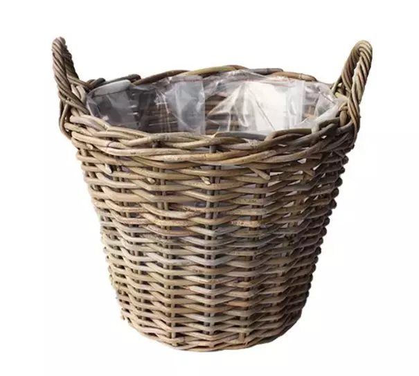 De aardappelmand is gemaakt van rotan. De binnenkant is afgedekt met plastic. De diameter van de mand is 30 cm, de hoogte is 23 cm en heeft een antiek grijze kleur.