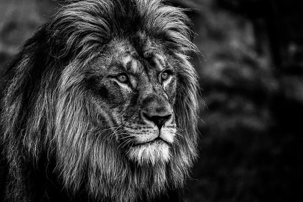 Een krachtig zwart-wit portret van een leeuw, waarbij elk detail van de manen is afleesbaar in het reflecterende glas. De monochrome stijl benadrukt de majestueuze uitstraling. Verzending via leverancier, wat de levertijd iets kan verlengen.