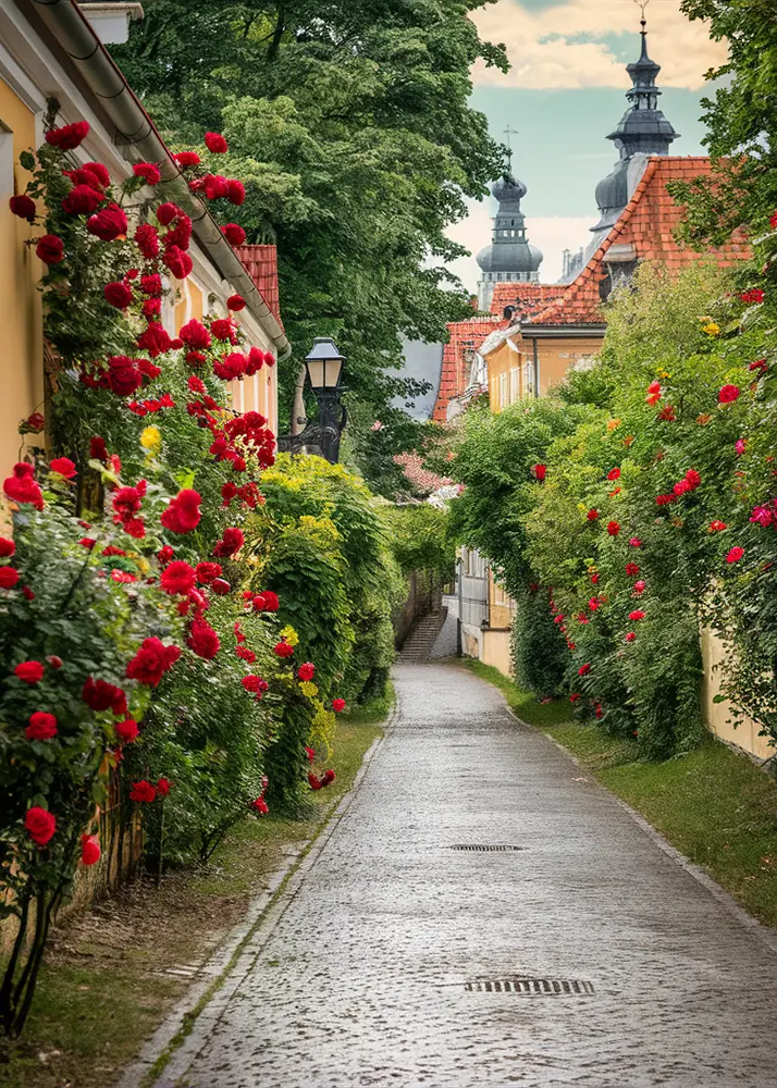 Het tuinschilderij Rozen Straat van Alexsar Art toont een charmante straat omzoomd met weelderige rozen in volle bloei. Dit kunstwerk (70x50 cm) vangt de romantische sfeer van een pittoreske bloemenstraat en brengt die levendigheid direct naar je tuin, balkon of terras. De rijke kleuren en het gedetailleerde ontwerp geven je buitenruimte een unieke uitstraling.