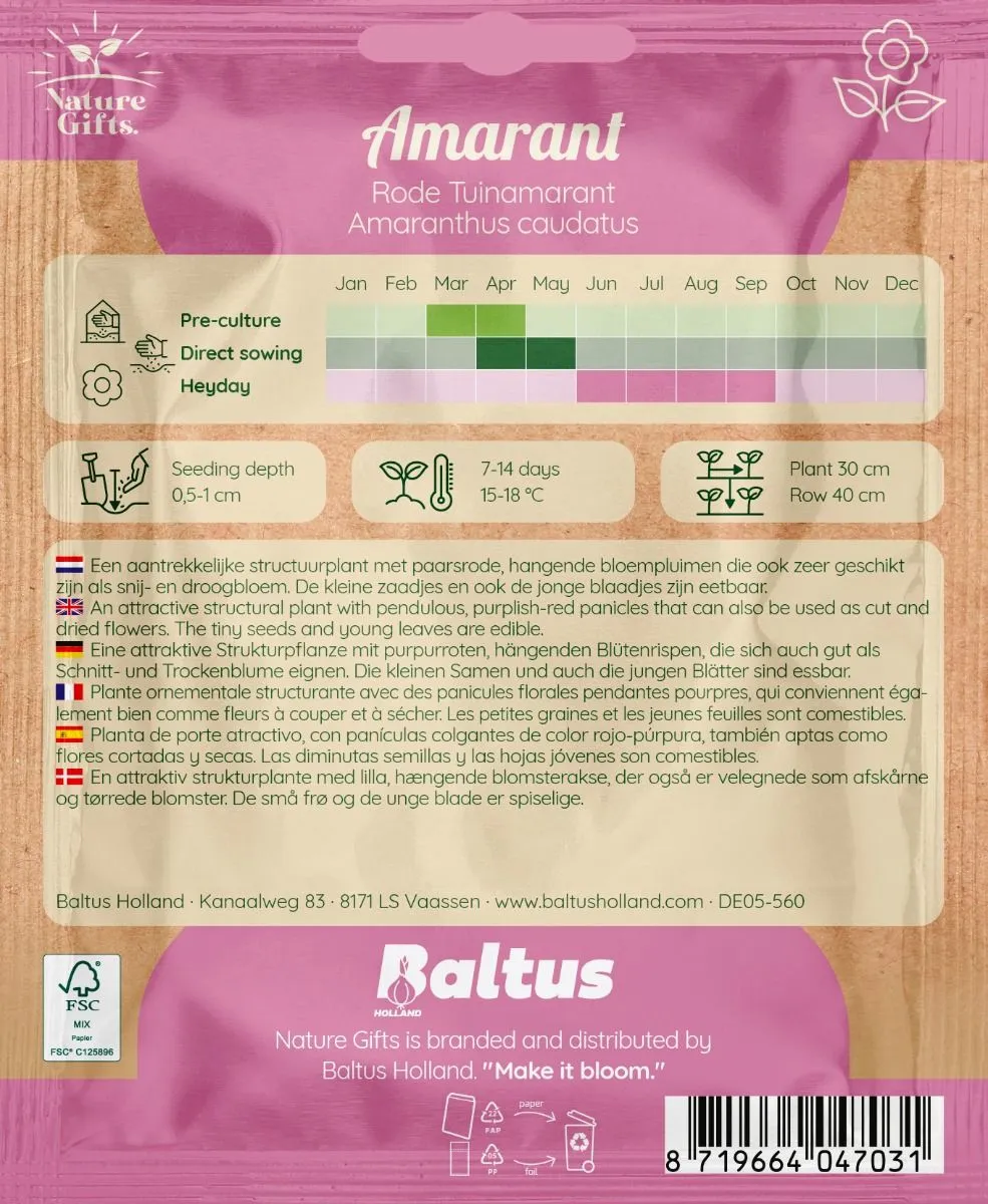 Een aantrekkelijke structuurplant met paarsrode, hangende bloempluimen die ook zeer geschikt zijn als snij- en droogbloemen. De kleine zaadjes en ook de jonge bloemen zijn eetbaar. Bloeit tussen juni en september.