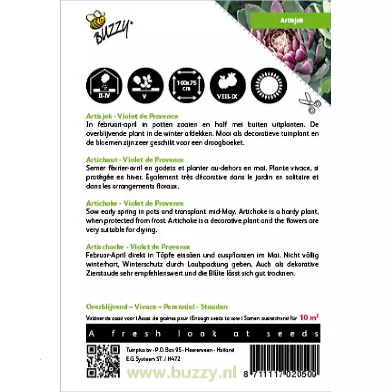 Artisjok – Violet de Provence_x005F_x000D_ Februari-april in potjes en half mei buiten uitplanten. Overblijvende plant,_x005F_x000D_ maar moet ‘s winters worden afgedekt. Ook zeer fraai als decoratieve tuinplant; de bloemen zijn tevens geschikt voor droog-boeketten._x005F_x000D_ _x005F_x000D_