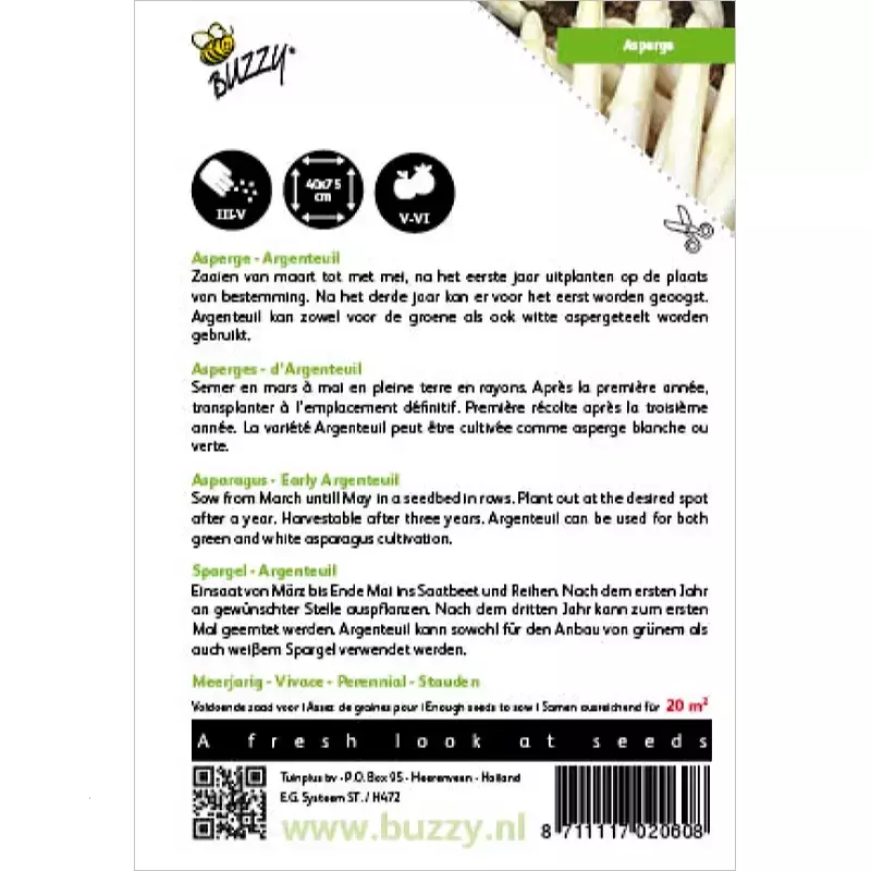 Asperge - Argenteuil_x005F_x000D_ Zaaien van maart tot met mei, na het eerste jaar uitplanten op de plaats_x005F_x000D_ van bestemming. Na het derde jaar kan er voor het eerst worden geoogst._x005F_x000D_ Argenteuil kan zowel voor de groene als ook witte aspergeteelt worden_x005F_x000D_ gebruikt._x005F_x000D_