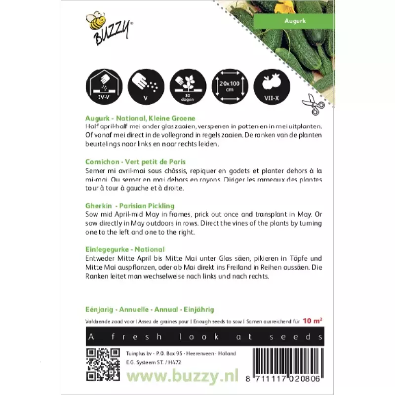 Augurk - National, Kleine Groene_x005F_x000D_ Half april-half mei onder glas zaaien, verspenen in potten en in mei uitplanten._x005F_x000D_ Of vanaf mei direct in de vollegrond in regels zaaien. De ranken van de planten beurtelings naar links en naar rechts leiden.