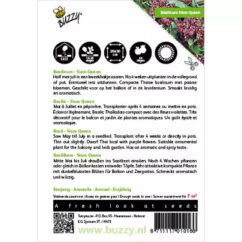 Basilicum - Siam Queen_x005F_x000D_ Mei tot juli in een kweekbakje en na ca. vier weken uitplanten of in een bloempot en wat uitdunnen. Compacte thaise basilicum met paarse bloemetjes; zeer geschikt voor balkon of siertuin._x005F_x000D_ _x005F_x000D_