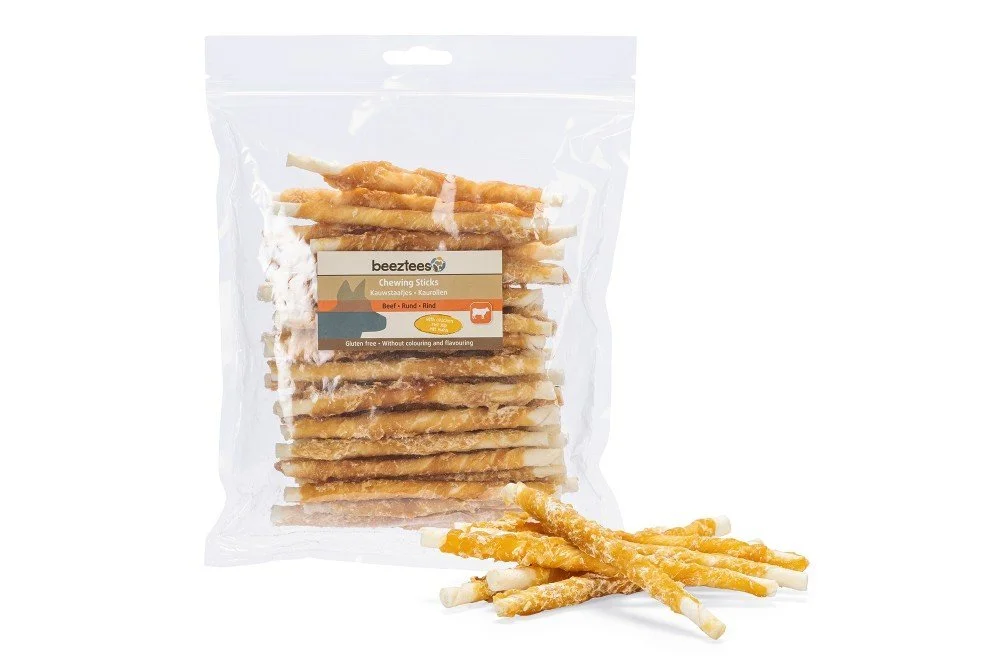 De Beeztees Kauwstaafjes Kip zijn een heerlijke, natuurlijke hondensnack gemaakt van runderhuid met laagjes kip, ideaal voor kauwplezier en zonder toegevoegde kleur- en smaakstoffen.
