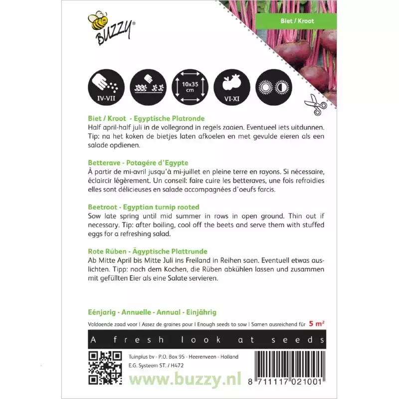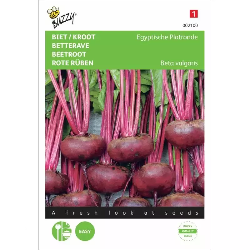 Biet / Kroot - Egyptische Platronde Half april-half juli in de vollegrond in regels zaaien. Eventueel iets uitdunnen. Tip: na het koken de bietjes laten afkoelen en met gevulde eieren als een salade opdienen.