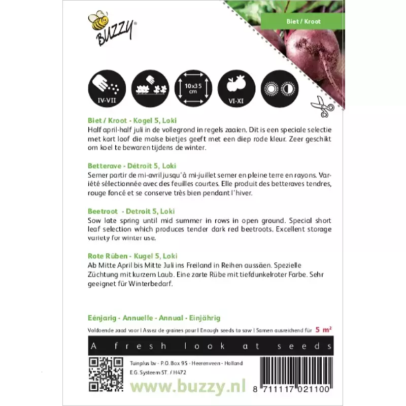 Biet / Kroot- Kogel 5 Loki_x005F_x000D_ Half april-half juli in de vollegrond in regels zaaien. Dit is een speciale selectie_x005F_x000D_ met kort loof die malse bietjes geeft met een diep rode kleur. Zeer geschikt_x005F_x000D_ om koel te bewaren tijdens de winter.