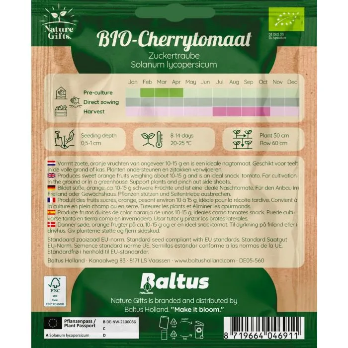 Deze biologische cherrytomaat vormt zoete, trossen vol rode vruchten van ongeveer 10-15 g. Oogsttijd: juni - oktober.