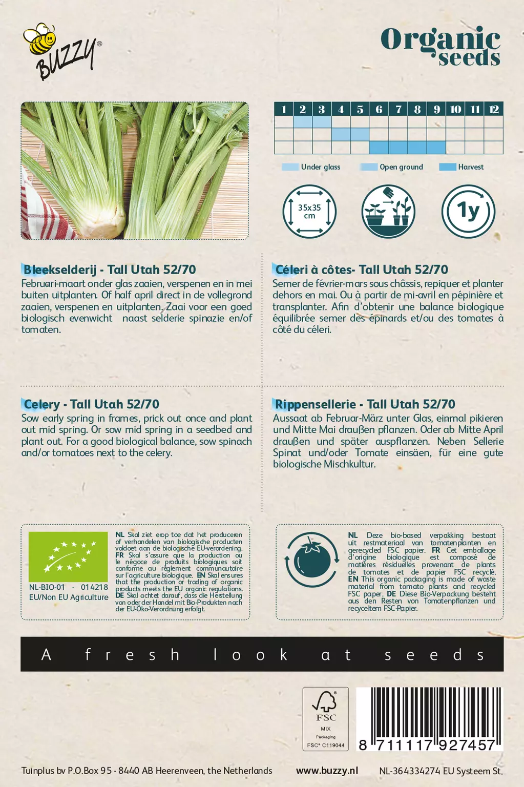 Bleekselderij - Tall Utah 52/70_x000D_ Februari-maart onder glas zaaien, verspenen en in mei buiten uitplanten. Of half april direct in de vollegrond zaaien, verspenen en uitplanten. Zaai voor een goed biologisch evenwicht naast selderie spinazie en/of tomaten.