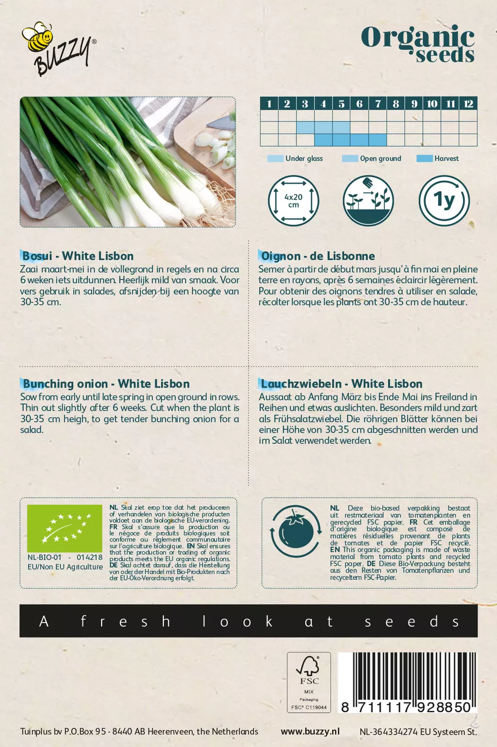 Bosui - White Lisbon_x000D_ Zaai maart-april in de vollegrond in regels en na circa 6 weken iets uitdunnen. Heerlijk mild van smaak. Voor vers gebruik in salades, afsnijden bij een hoogte van 30-35 cm.