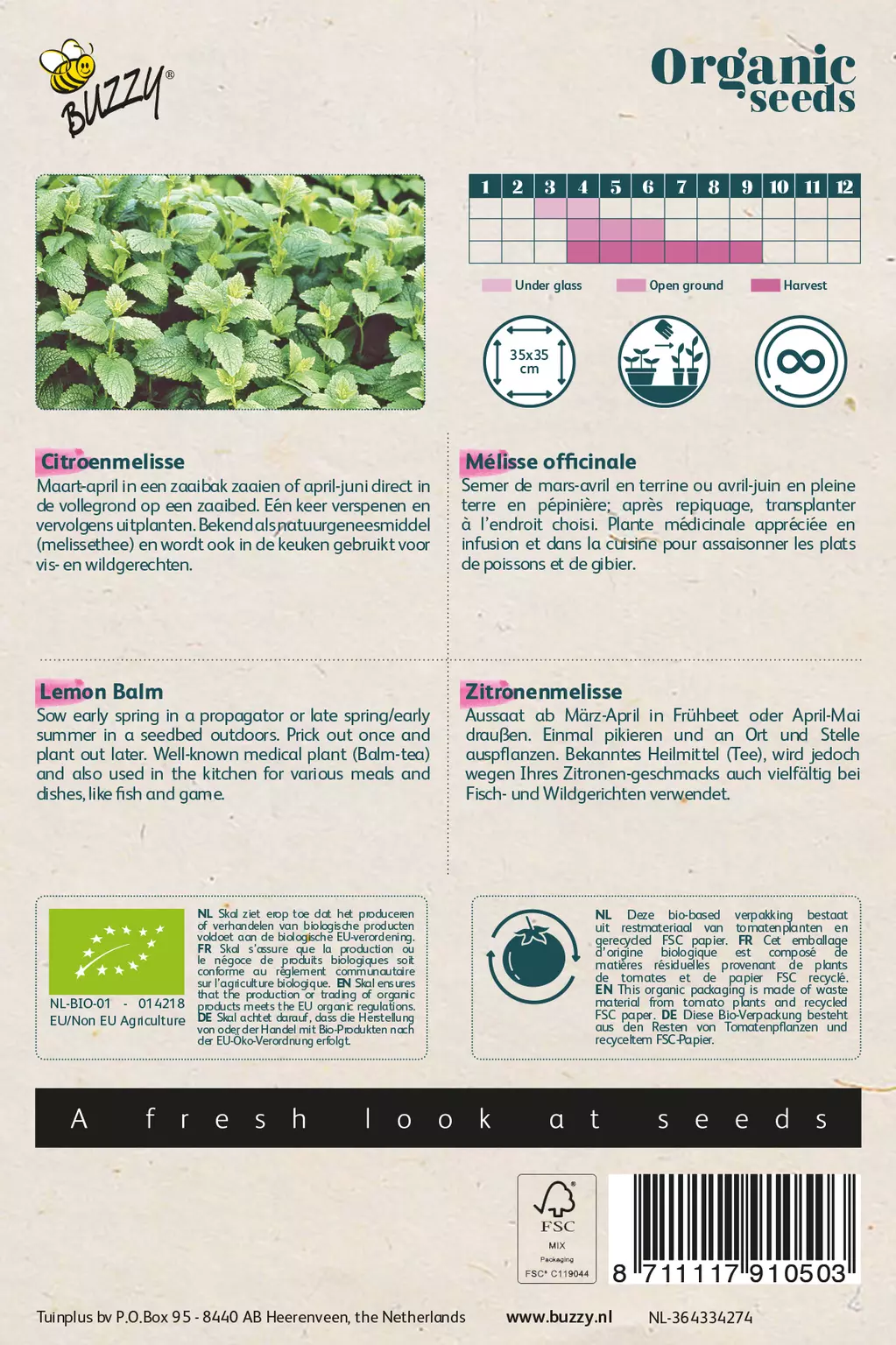 Citroenmelisse_x000D_ Maart-april in een zaaibak zaaien of april-juni direct in de vollegrond op een zaaibed. Eén keer verspenen en vervolgens uitplanten. Bekend als natuurgeneesmiddel (melissethee) en wordt ook in de keuken gebruikt voor vis- en wildgerechten.