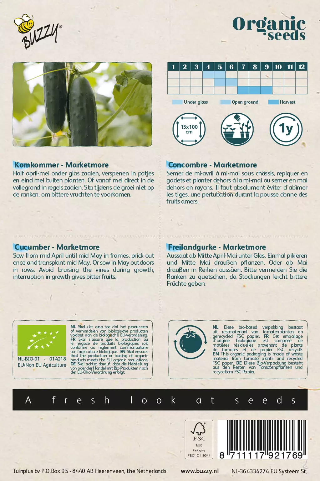Komkommer - Marketmore_x000D_ Half april-mei onder glas zaaien, verspenen in potjes en eind mei buiten planten. Of vanaf mei direct in de vollegrond in regels zaaien. Sta tijdens de groei niet op de ranken, om bittere vruchten te voorkomen.