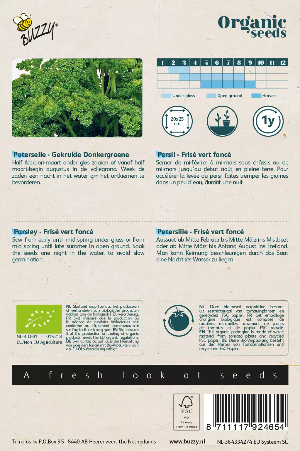 Peterselie - Gekrulde Donkergroene_x000D_ Half februari-maart onder glas zaaien of vanaf half maart-begin augustus in de vollegrond. Week de zaden een nacht in het water om het ontkiemen te bevorderen.