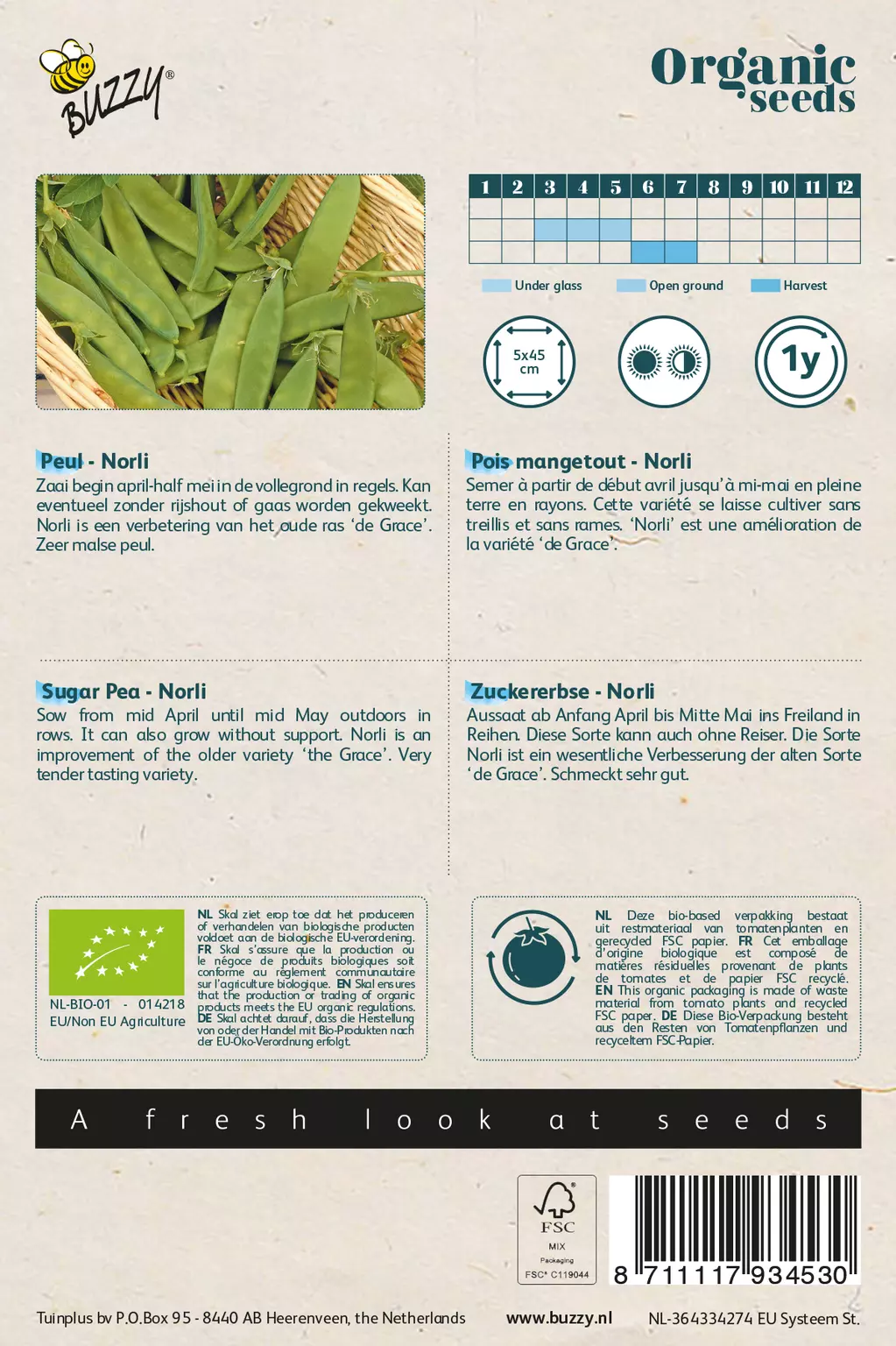 Peul - Norli_x000D_ Zaai begin april-half mei in de vollegrond in regels. Kan eventueel zonder rijshout of gaas worden gekweekt. Norli is een verbetering van het oude ras ‘de Grace’. Zeer malse peul.