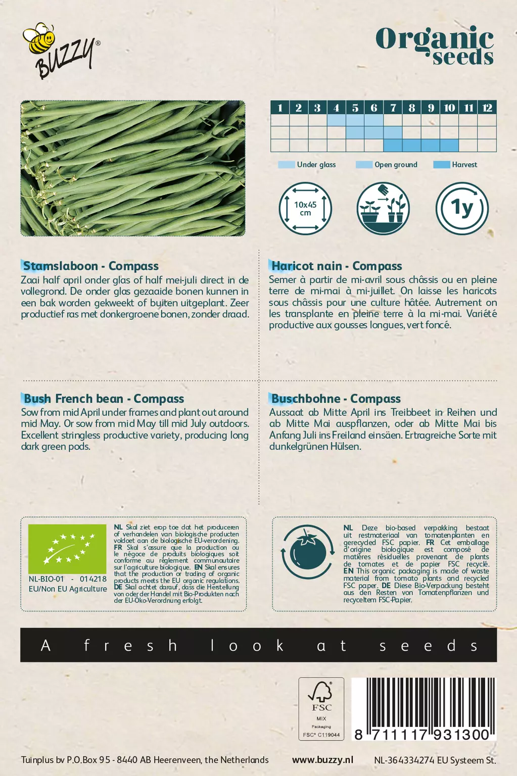 Stamslaboon - Compass_x000D_ Zaai half april onder glas of half mei-juli direct in de vollegrond. De onder glas gezaaide bonen kunnen in een bak worden gekweekt of buiten uitgeplant. Zeer productief ras met donkergroene bonen, zonder draad.
