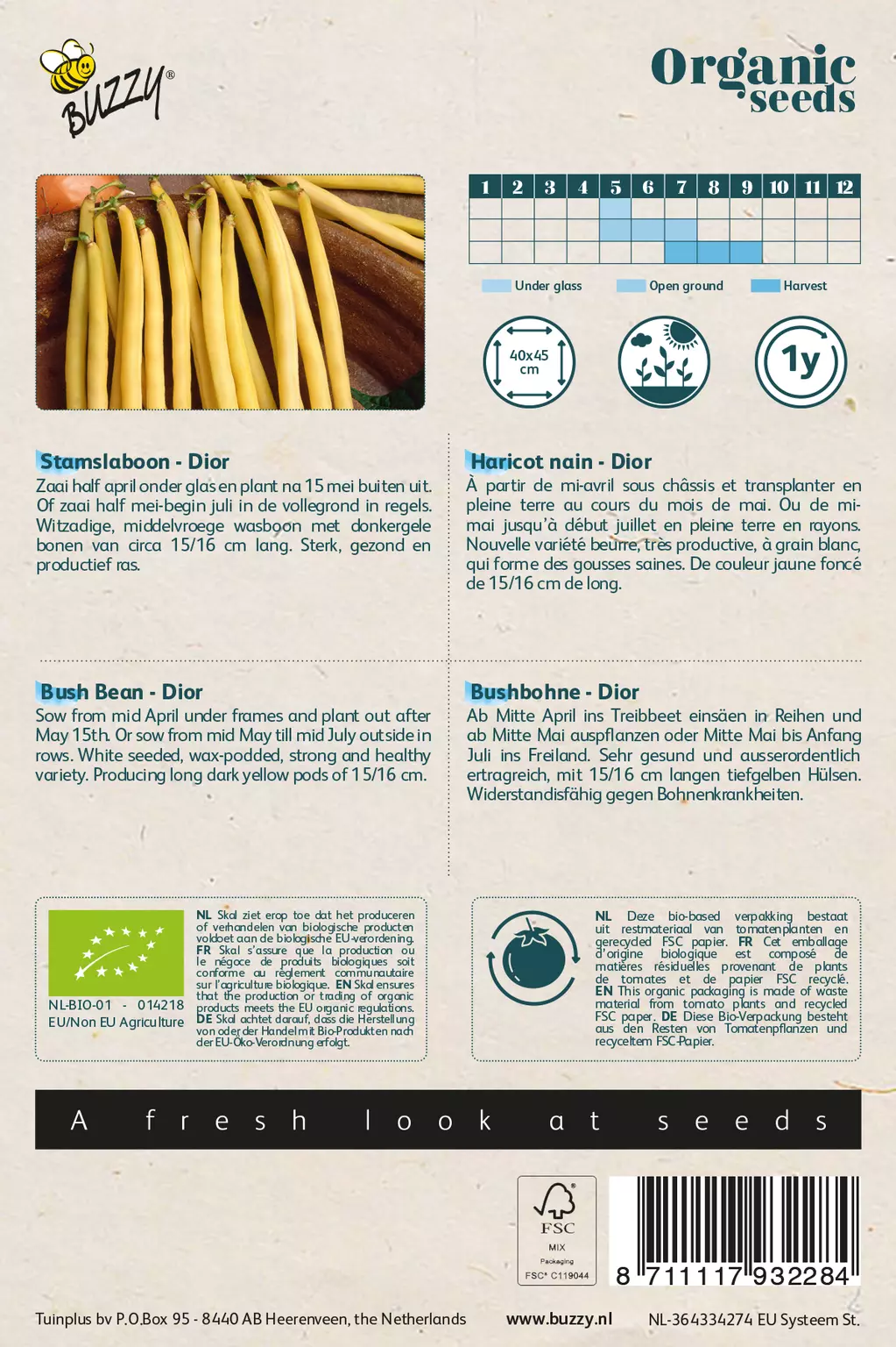 Lage stamslaboon - Hildora_x000D_ Zaai half april onder glas en plant na 15 mei buiten uit. Of zaai half mei-begin juli in de vollegrond in regels. Witzadige, middelvroege wasboon met donkergele bonen van circa 15/16 cm lang. Sterk, gezond en productief ras.