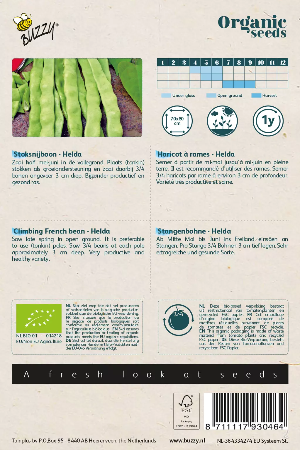 Stoksnijboon - Helda_x000D_ Zaai half mei-juni in de vollegrond. Plaats (tonkin) stokken als groeiondersteuning en zaai daarbij 3/4 bonen ongeveer 3 cm diep. Bijzonder productief en gezond ras.
