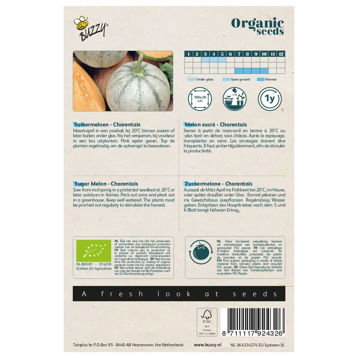 Suikermeloen - Charentais_x000D_ Maart-april in een zaaibak bij 20°C binnen zaaien of later buiten onder glas. Na het verspenen, bij voorkeur in een kas uitplanten. Flink water geven. Top de planten regelmatig om de opbrengst te bevorderen.