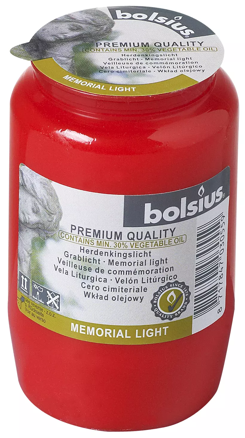 Bolsius kaarsen zijn van premium kwaliteit. Deze gedenklichten zijn ideaal vanwege hun lange brandtijd. Het glazen potje zorgt ervoor dat deze kaarsen buiten goed aanblijven. Deze kaars heeft een brandtijd van 52 uur. Bolsius Herdenkinslicht Nr.7 Rood is een navulverpakking van het Bolsius gedenklicht met deksel. Het is geschikt om vele uren probleemloos te laten branden. De herdenkingskaars zorgt ervoor dat je een dierbare op een liefdevolle manier kan gedenken. De kaars is alleen geschikt voor gebruik buitenshuis en heeft een ronde vorm.