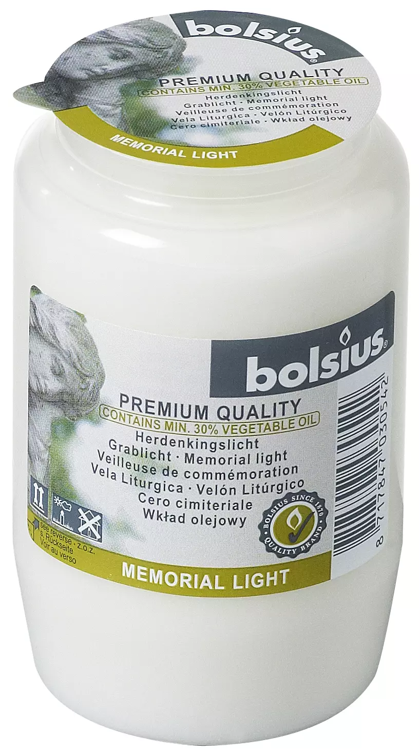 Deze premium kaarsen van Bolsius. Ideaal voor buiten vanwege hun lange brandtijd en het glazen potje. Deze kaars heeft een brandtijd van 85 uur.De Bolsius grafkaars nr. 3 heeft een lange brandtijd en bevat plantaardige olie, waardoor ze nog schoner en beter opbranden. De kaarsen zijn alleen geschikt voor buitengebruik. De vlam van het graflicht is stabiel en rustig en de kaarsjes branden tot de bodem leeg. De brandtijd is maar liefst 50 uur en de kleur van het gedenklicht is wit.
