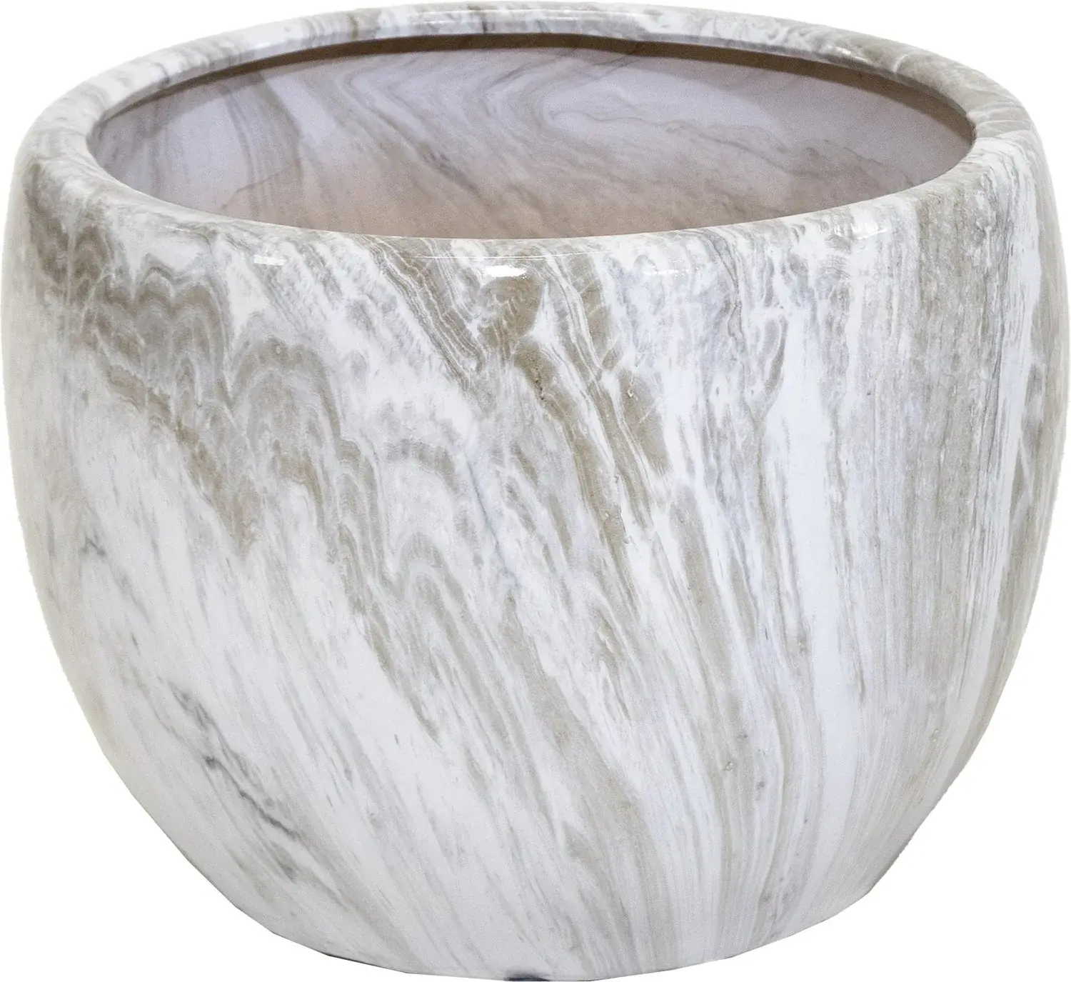 De grijze Emperor bloempot van Mega Collections is een ronde keramische plantenpot met een subtiel marmerlook patroon en glanzende, gladde afwerking die direct een moderne en verfijnde sfeer toevoegt aan je interieur. De lichtgrijze kleur combineert moeiteloos met uiteenlopende woonstijlen, van Scandinavisch en minimalistisch tot warm en klassiek, waardoor deze pot een veelzijdige keuze is voor elke kamer. Deze pot is speciaal ontwikkeld voor gebruik binnenshuis en voelt stevig aan dankzij het hoogwaardige keramische materiaal. Door het ontbreken van een afwateringsgat is deze bloempot ideaal om te gebruiken met een binnenpot of schotel om overtollig water op te vangen en je meubels te beschermen.