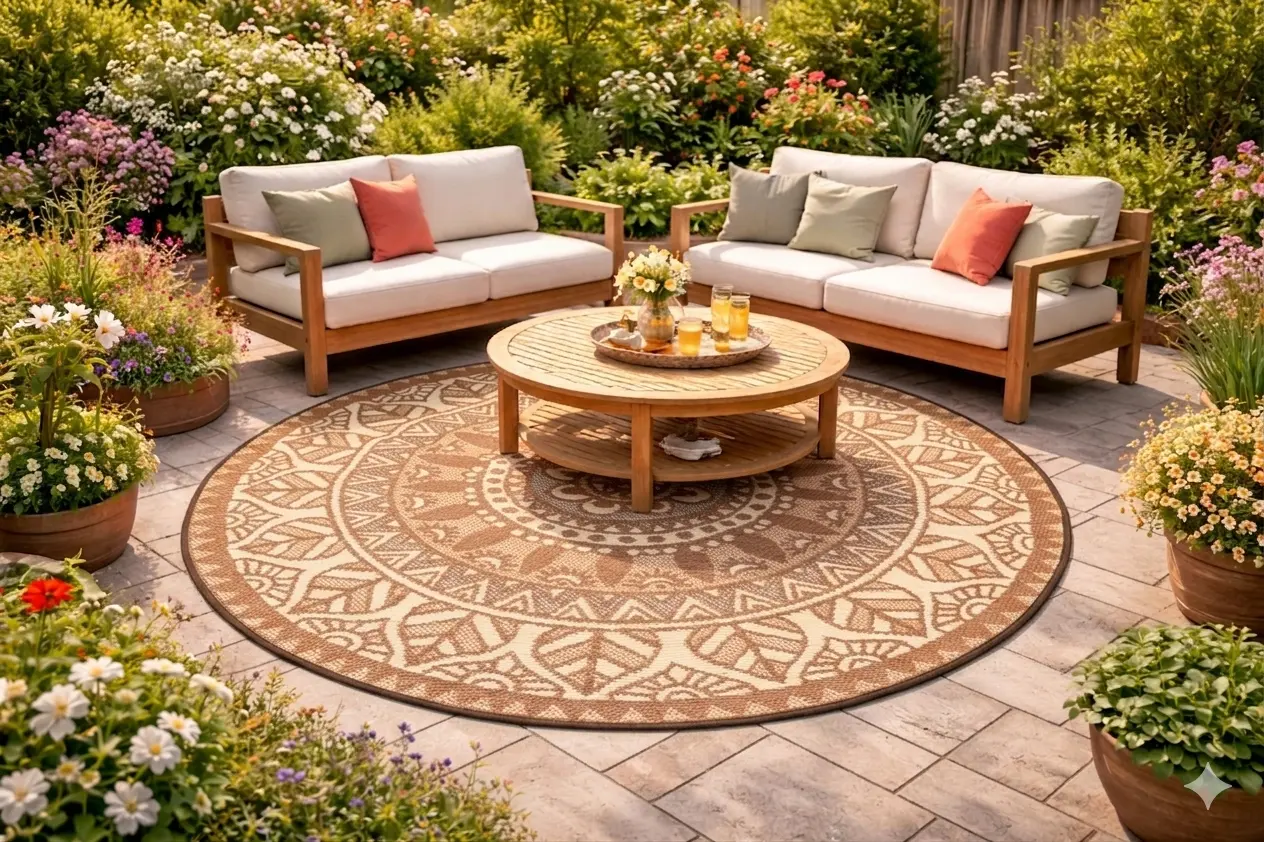 Breng een warme, natuurlijke sfeer naar je terras met dit ronde buitenkleed. De ideale keuze voor een rustieke look die perfect samengaat met houten tuinmeubels.