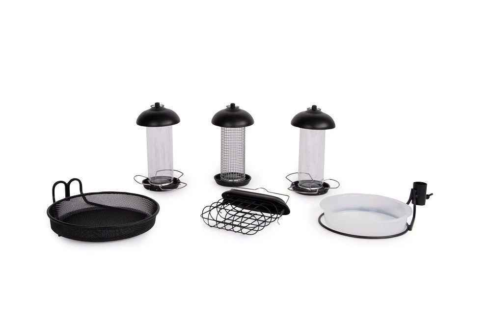 - Compleet pakket: Inclusief twee vogelzaad silo's, een metalen pinda silo, een pindacake hanger, een metalen mesh voedertafel, een waterschaal en een extra arm voor meer voedingsopties.