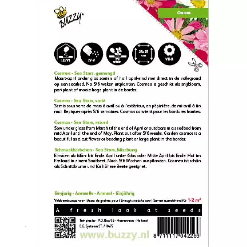 Buzzy Seeds is toegewijd aan het produceren van de beste zaden. De zaden zijn 100% natuurlijk en niet genetisch gemanipuleerd. Naast alle verplichte EU voorwaarden, moeten de zaden ook voldoen aan de eisen van Buzzy Seeds zelf. Hierdoor controleren zij eigenhandig de zaden in het laboratorium en de proefvelden, waardoor de producten van aanzienlijke waarde worden aangeboden. Bekijk hier het assortiment van Buzzy Seeds bij Toptuincentrum.