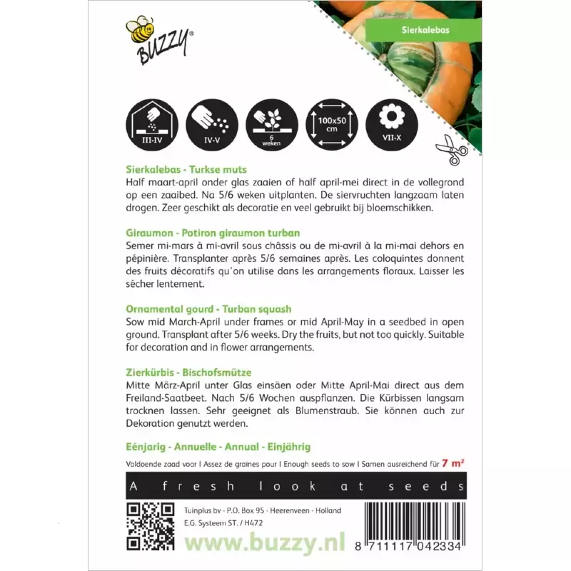 Sierkalebas - Turkse muts_x005F_x000D_ Half maart-april onder glas zaaien of half april-mei direct in de vollegrond_x005F_x000D_ op een zaaibed. Na 5/6 weken uitplanten. De siervruchten langzaam laten_x005F_x000D_ drogen. Zeer geschikt als decoratie en veel gebruikt bij bloemschikken._x005F_x000D_ _x005F_x000D_