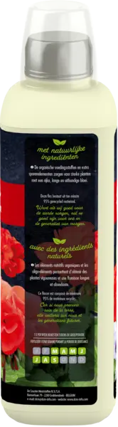 Geef je geraniums en andere bloeiende planten de voeding die ze nodig hebben met DCM Vloeibare Plantenvoeding Geraniums & Bloeiende Planten. Deze hoogwaardige vloeibare meststof zorgt voor sterke planten en een rijke, uitbundige bloei. Dankzij de uitgebalanceerde samenstelling met NPK 3-2-5, sporenelementen en plantaardige aminozuren, stimuleert deze voeding een gezonde groei en langdurige bloei.