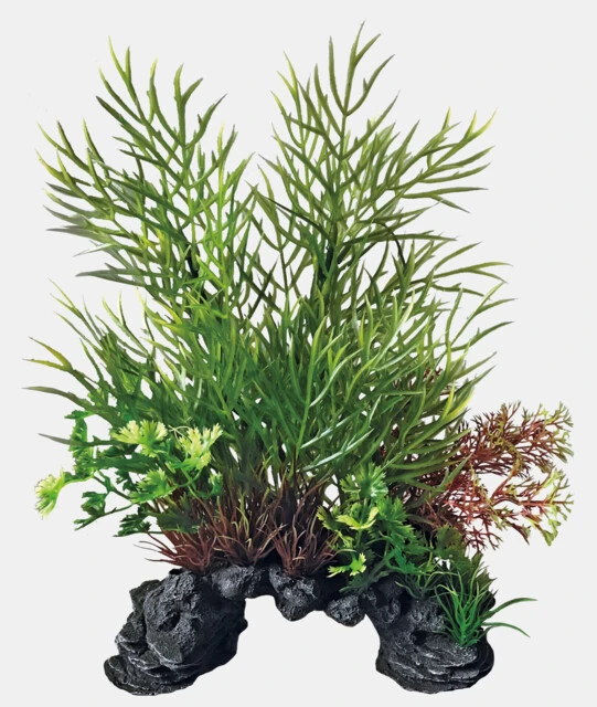 Met deze kunststof planten op rots kunt u eenvoudig uw Aquarium inrichten. Druk de basis van het ornament in het aquariumgrind en beweeg het heen en weer totdat deze stevig in het grind staat. De planten en rotsen zien er realistisch uit en zijn 100% veilig voor uw vissen en het aquarium ecosysteem.