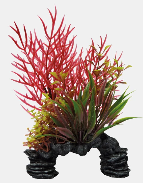 Met deze kunststof planten op rots kunt u eenvoudig uw Aquarium inrichten. Druk de basis van het ornament in het aquariumgrind en beweeg het heen en weer totdat deze stevig in het grind staat. De planten en rotsen zien er realistisch uit en zijn 100% veilig voor uw vissen en het aquarium ecosysteem.