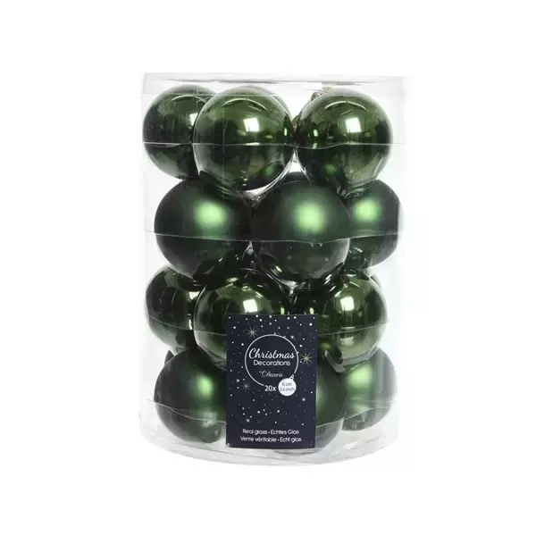 Dennengroene glazen kerstballen (Ø6 cm) in een set van 20 stuks, ideaal voor een natuurlijke en rustieke kerstsfeer.