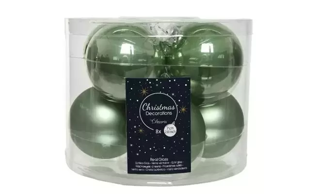 Breng een rustgevende, natuurlijke tint naar je kerstdecoraties met de Decoris Kerstballen Set in saliegroen. Deze set van 8 glazen kerstballen van 7 cm heeft een zachte, groengrijze kleur en komt in een mix van glanzende en matte afwerkingen. De saliegroene kleur voegt een verfijnde en serene uitstraling toe aan je kerstboom, ideaal voor een stijlvolle en rustige kerstversiering.