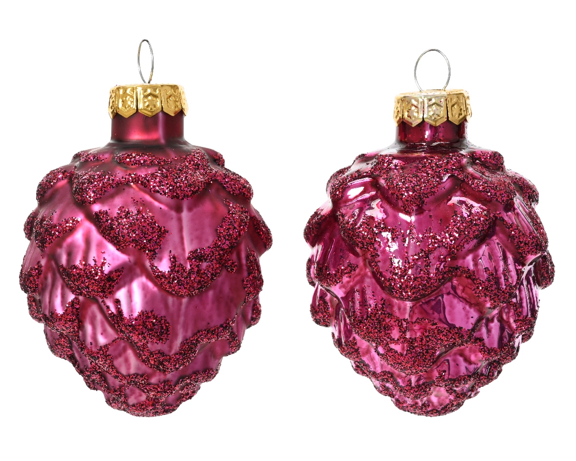 Granaatappelrode glazen dennenappels voor een luxe en feestelijke kerstversiering.