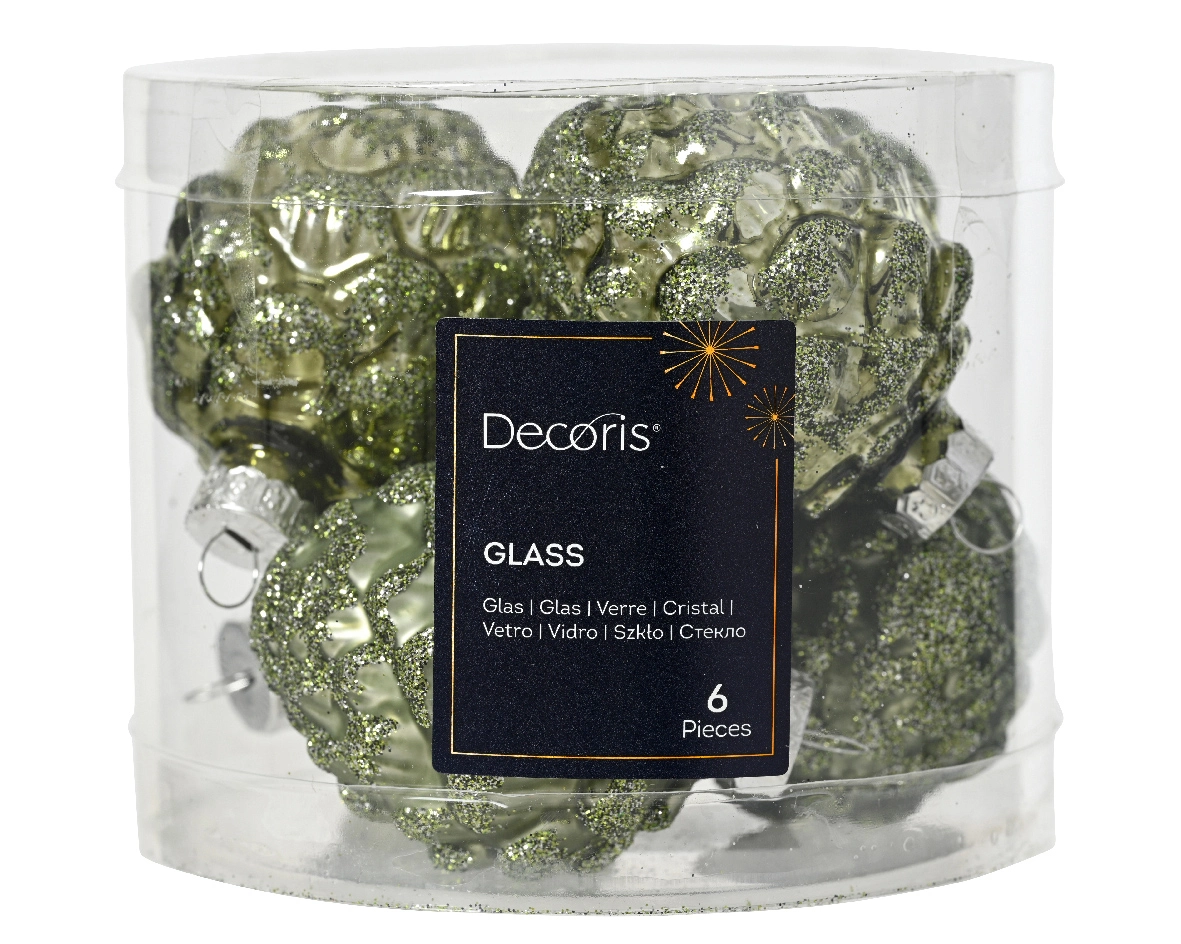 Decoris Kerstballen glas dennenappel 6st rosemarijn 5x7cm