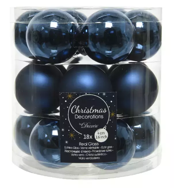 Voeg een luxe en mysterieuze tint toe aan je kerstdecoratie met de nachtblauwe kerstballen van Decoris. Deze glazen ballen van 4 cm hebben een diepe, blauwe kleur die een elegante en sfeervolle uitstraling geeft. De set van 18 ballen bevat een mooie mix van matte en glanzende afwerkingen – 6 matte en 12 glanzende ballen – voor een schitterend effect. Perfect voor een stijlvolle en moderne kerstboom.