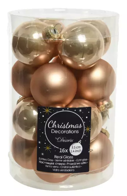 Breng warmte en elegantie naar je kerstboom met deze prachtige set kerstballen van Decoris. Deze set bevat 16 glazen kerstballen in een rijke toffeekleur. Met een diameter van 3,5 cm zijn deze ballen ideaal om een warme en verfijnde uitstraling aan je kerstversiering te geven. De set bestaat uit een combinatie van 8 matte en 8 glanzende ballen, wat zorgt voor een mooi contrast en een subtiele glans.