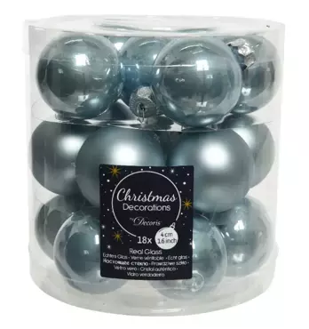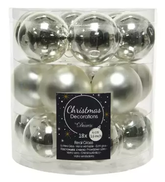 Creëer een frisse en sprankelende kerstboom met de winterwitte kerstballen van Decoris. Deze glazen ballen van 4 cm hebben een heldere, witte kleur die je kerstdecoratie een koele en elegante uitstraling geeft. De set van 18 ballen bevat zowel matte als glanzende afwerkingen – 6 matte en 12 glanzende ballen – voor een mooi en veelzijdig effect. Ideaal voor een moderne en winterse kerstversiering.