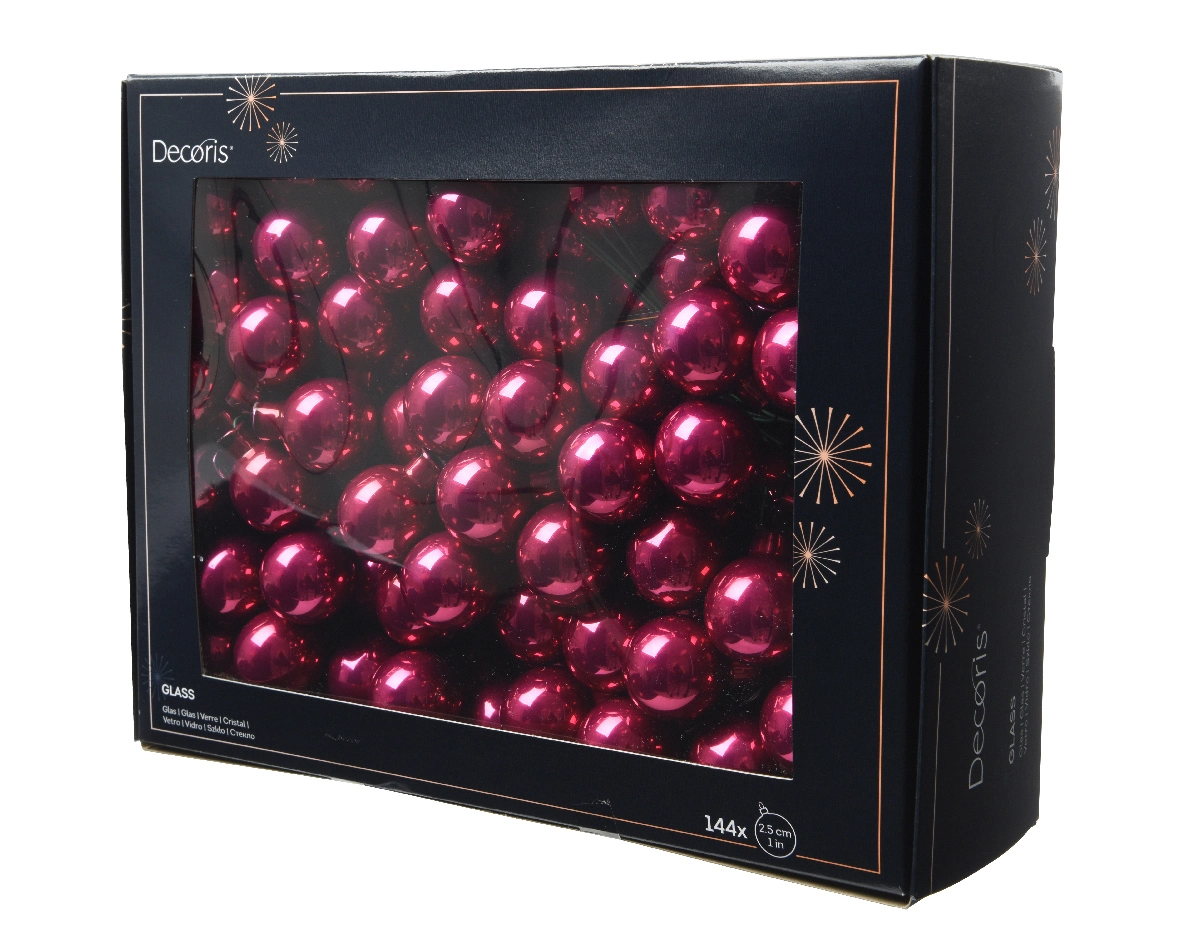 Voeg een sprankelende en luxe uitstraling toe aan je kerstdecoratie met deze uitgebreide set van Decoris. Deze set bevat 144 kleine glazen kerstballen in de rijke kleur granaatappel, elk met een diameter van 2,5 cm en bevestigd aan een handige draad. De diepe, feestelijke tint van granaatappel voegt een warme en elegante sfeer toe aan je kerstboom, perfect voor een luxe en sfeervolle uitstraling.