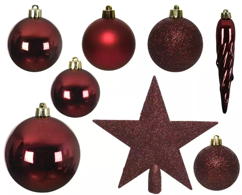 Met deze mix van donker rode kerstballen kan je eenvoudig en snel jouw (kunst)boom opvrolijken. Kerstballen zijn nou eenmaal onmisbaar tijdens de kerstperiode. Naast je boom is om ze in een vaas of op een dienblad te leggen ter decoratie. In deze mix zit ook een piek die perfect bij de ballen kleurt, ideaal! Met deze kerstballen creëer je gelijk een gezellige sfeer in en rondom je huis. Deze kerstballen zijn af te wisselen met: traditionele kerstballen, kerstverlichting en overige decoratie om zo een originele, warme kerstboom te hebben in de woonkamer die volledig tot zijn recht komt!
