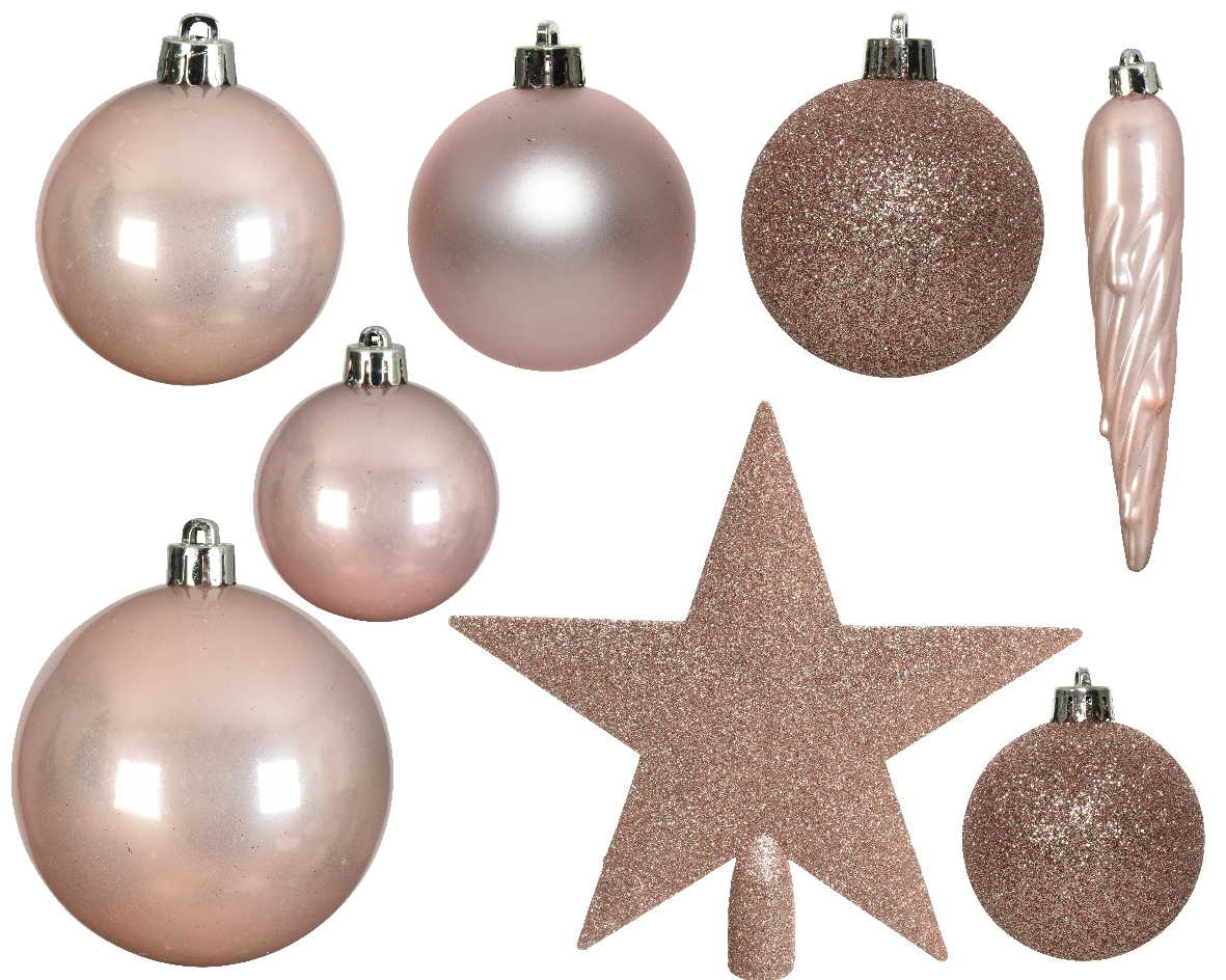 Voeg een vleugje verfijning en charme toe aan je kerstdecoraties met deze elegante kerstballen set van Decoris. Deze set bestaat uit een fraaie mix van kerstballen en een stijlvolle piek, ideaal voor een kerstboom die warmte en gezelligheid uitstraalt. Met deze set geef je je kerstboom een subtiele en stijlvolle uitstraling. De delicate tint van zacht roze in combinatie met de diverse afwerkingen zorgt voor een elegante en betoverende kerstversiering die een warme sfeer in je huis brengt.