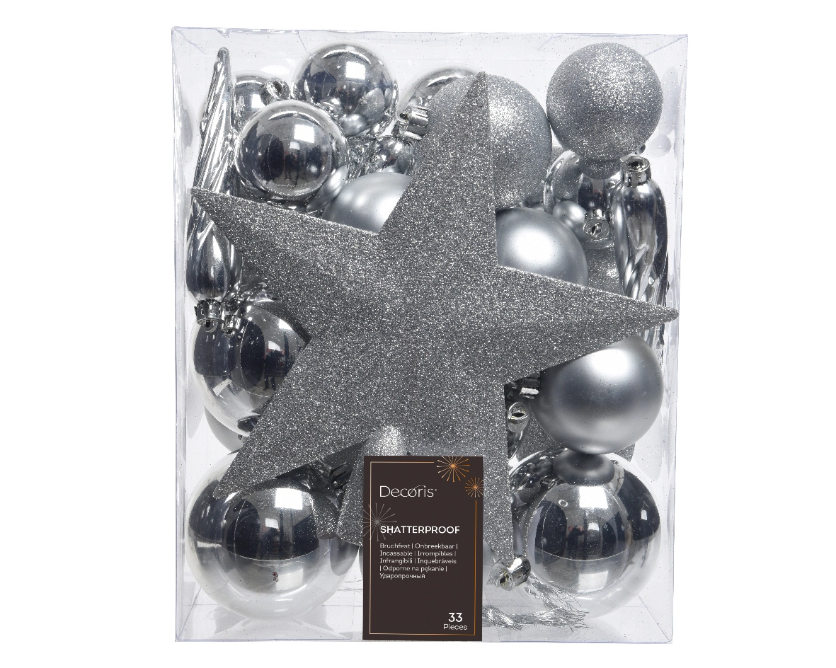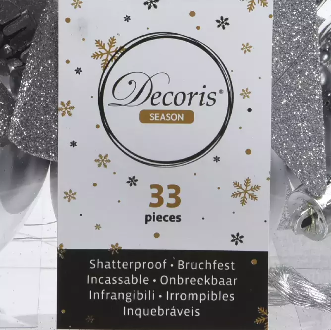 Schrijf zelf een recensie over "Decoris kerstballen Plastic mix+piek 33st zilver"