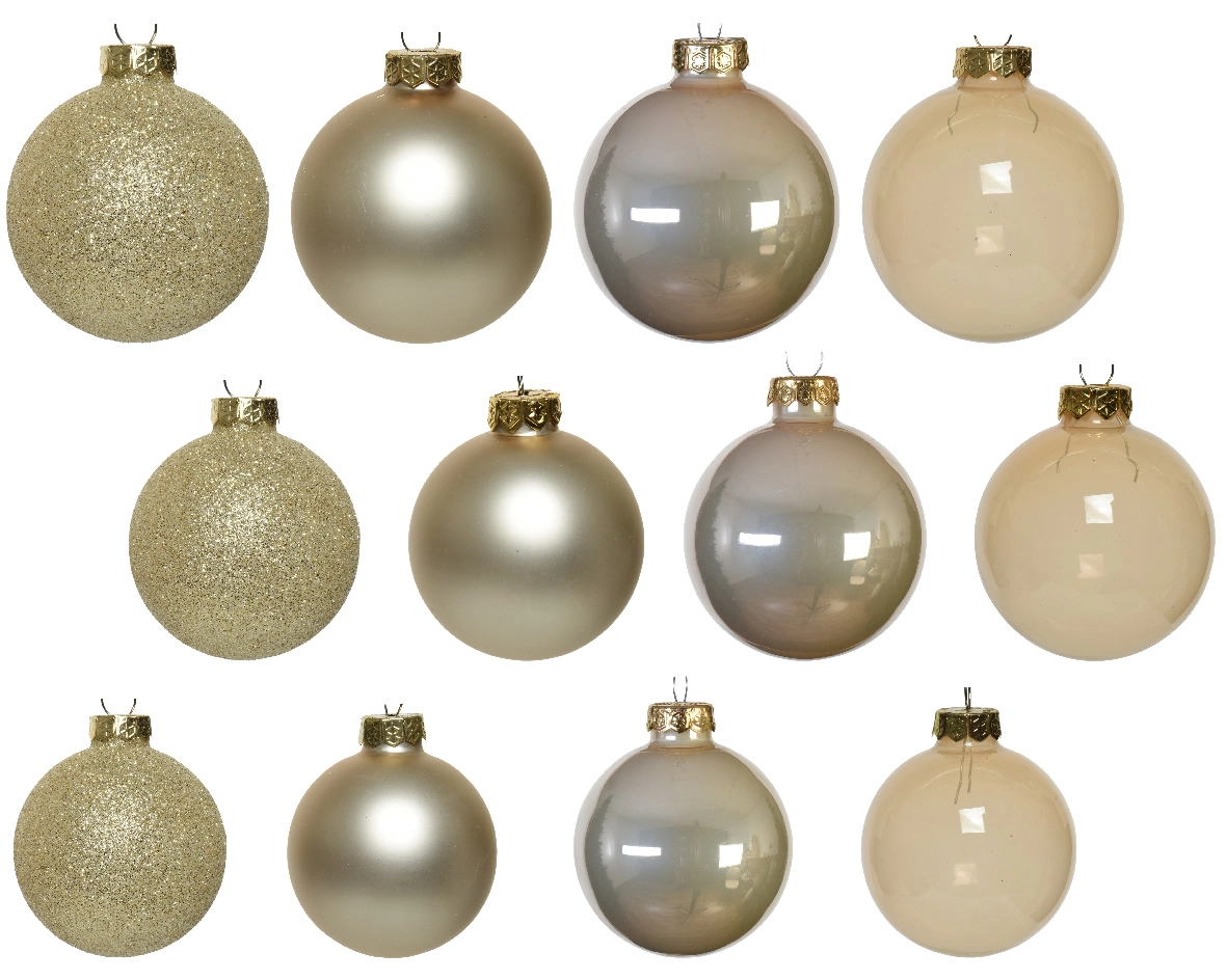 Deze set bevat 42 glazen kerstballen in de maten 10 stuks van 7 cm, 20 stuks van 6 cm, en 12 stuks van 5 cm.
