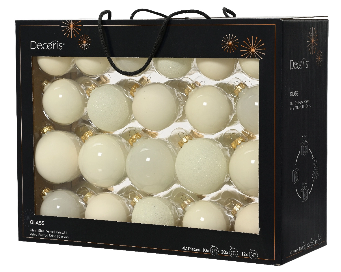 Schrijf zelf een recensie over "Decoris kerstballen set Glas 42st wolwit 5-6-7cm"