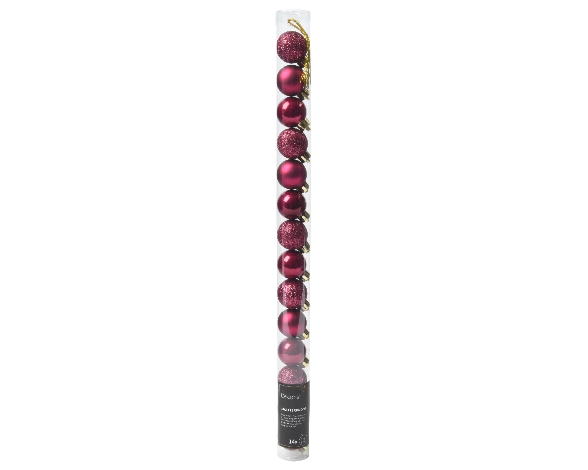 Geef je kerstboom een rijke, feestelijke look met deze set van 14 granaatappelrode kerstballen van Decoris. Gemaakt van stevig en licht plastic, zijn ze makkelijk in gebruik en gaan ze lang mee.