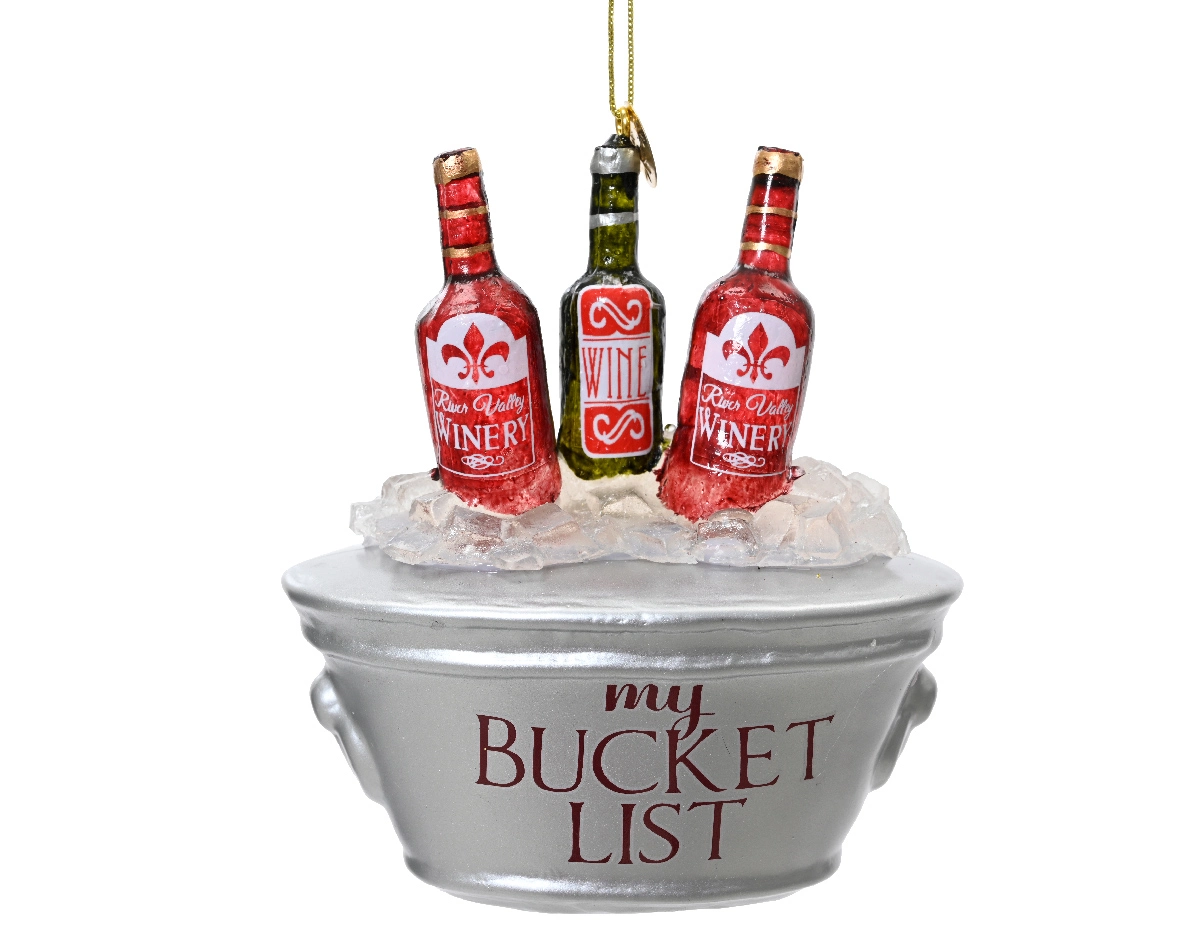 Het ornament toont een elegante emmer gevuld met wijnflessen, perfect afgewerkt met ijsdetails die een feestelijke en luxe uitstraling geven. Dit ornament is ideaal voor wijnliefhebbers en voegt een unieke en stijlvolle flair toe aan je kerstdecoratie.