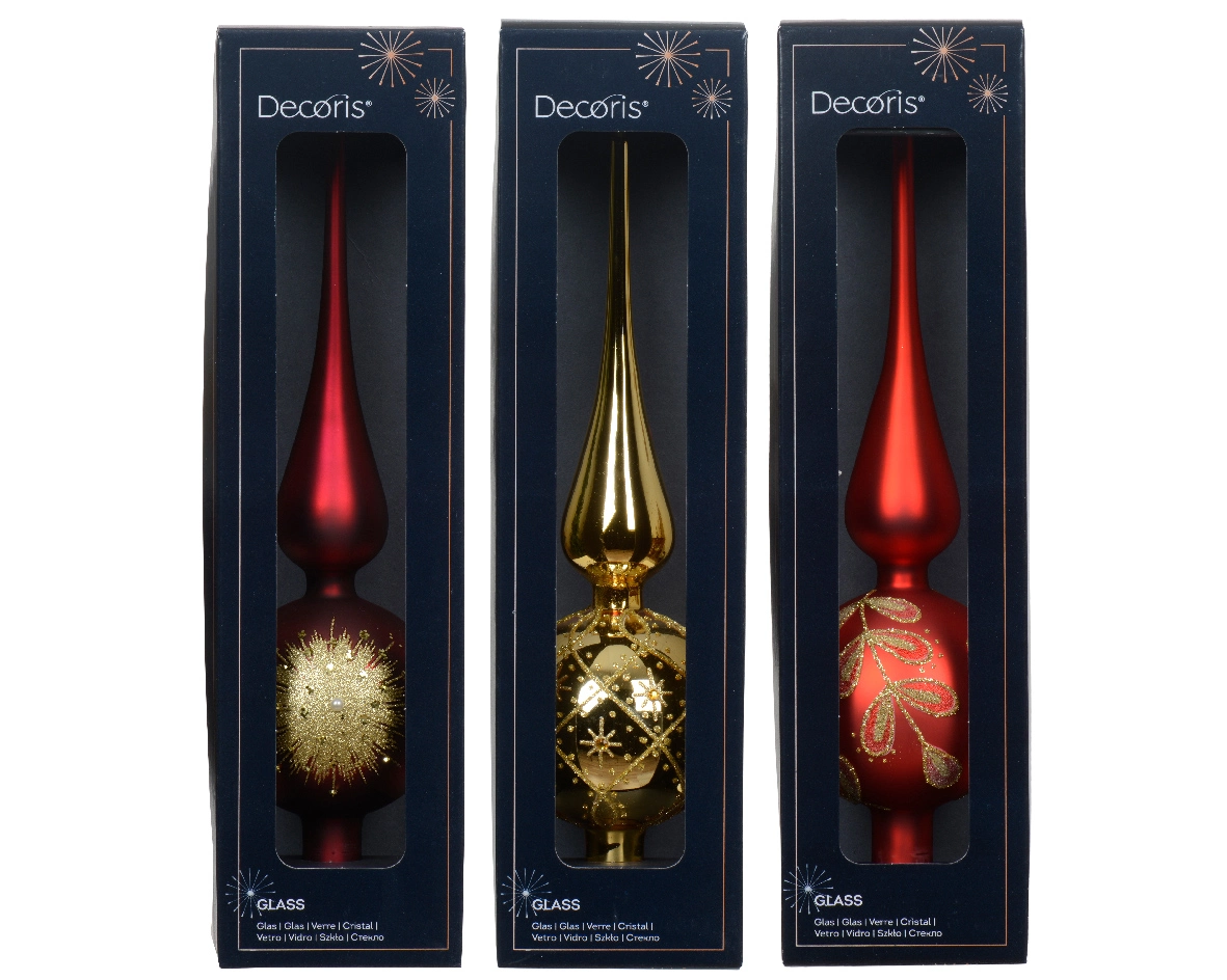 Geef je kerstboom een stijlvolle en feestelijke uitstraling met deze elegante glazen kerstboom piek van Decoris. Met een hoogte van 31 cm is deze piek een perfecte aanvulling op je kerstdecoraties. Verkrijgbaar in verschillende schitterende kleuren, waaronder Rood & Goud, zodat je de kleur kunt kiezen die het beste bij jouw decor past.