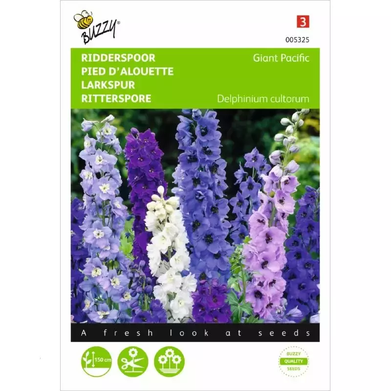 Ridderspoor - Giant Pacific, gemengd_x000D_ Half mei-juli op een zaaibed zaaien en in oktober-november uitplanten. Of_x000D_ zaai de riddersporen in maart onder glas, zodat ze al het eerste jaar bloeien.