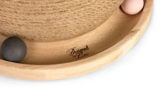 De Designed by Lotte Krab- en speelbol Mila biedt een combinatie van speelplezier en krabmogelijkheden, met een ronde voet inclusief sleuf waarin balletjes liggen die rollen wanneer jouw kat ertegen tikt, terwijl de krabbol bovenop omwikkeld is met jute touw voor nagelverzorging, inclusief een toegevoegd veertje voor extra amusement, allemaal gemaakt van rubberhout, met afmetingen van 29,5×29,5×22 cm.